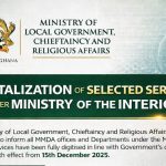 https://e-services.mint.gov.gh The Ministry of Local Government, Chieftaincy and Religious Affairs (MLGCRA) wishes to inform all MMDAs and Departments under the Ministry that the ministry of interior has fully digitised selected services, in line with Government’s digitalisation agenda.